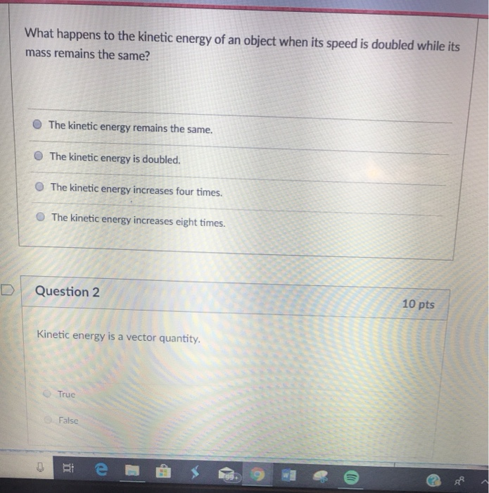 Similarly what happens to kinetic energy when speed increases. The translational kinetic energy of an object with mass m whose center of mass is moving with speed v is K ½mv 2. When an object doubles its speed the kinetic energy increases by a factor of a 1 d 6 b 2 e 8 c 4 10.